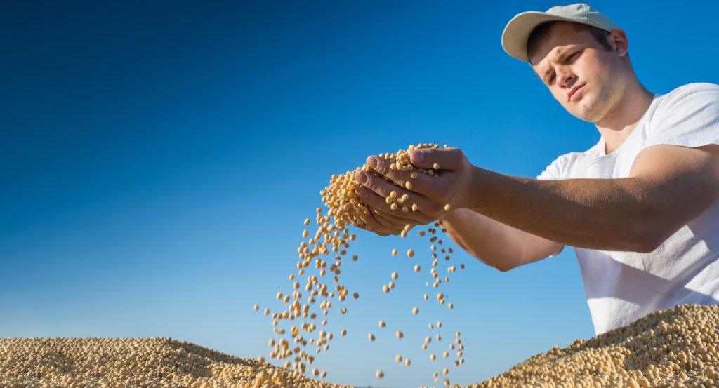 Senior hardworking farmer agronomist in soybean field checking crops before harvest.